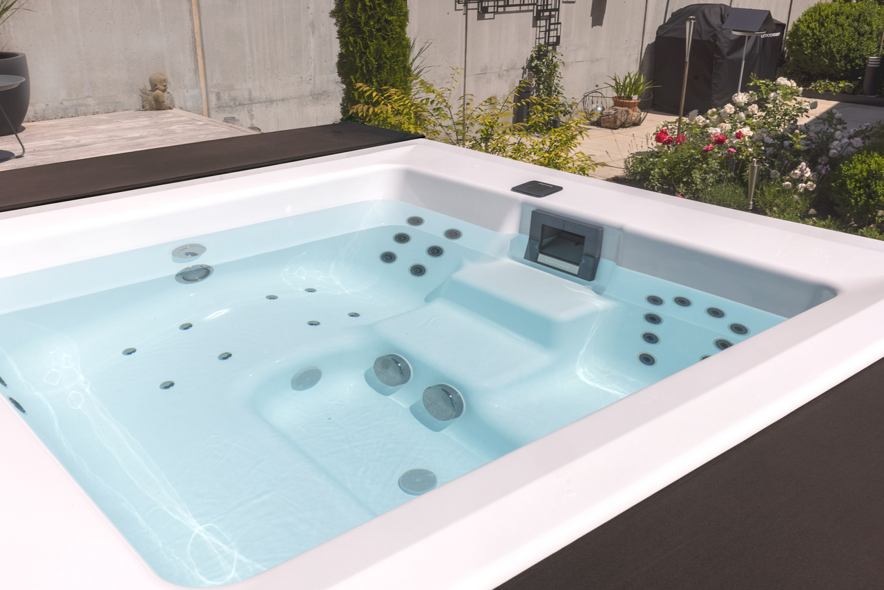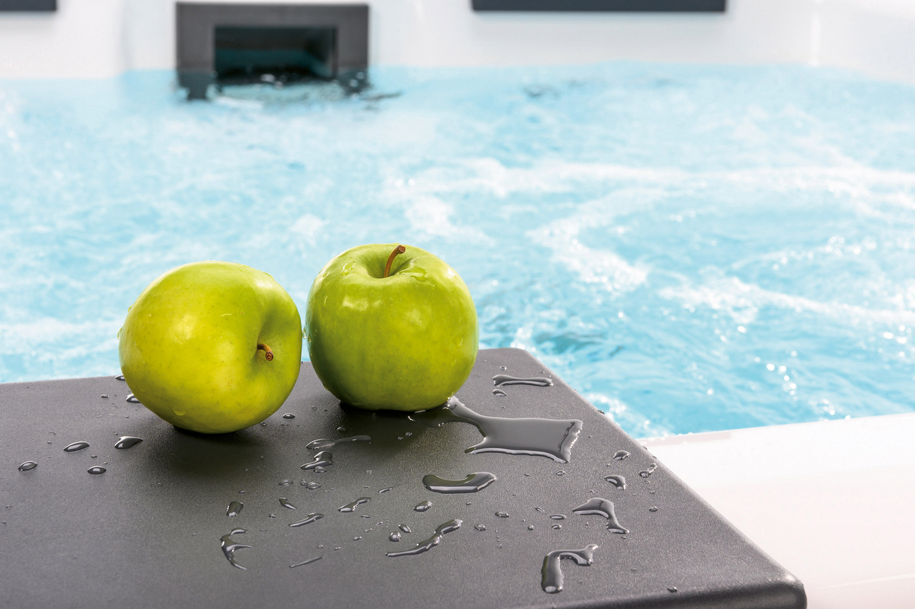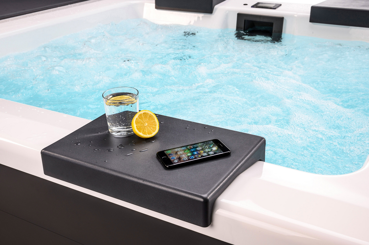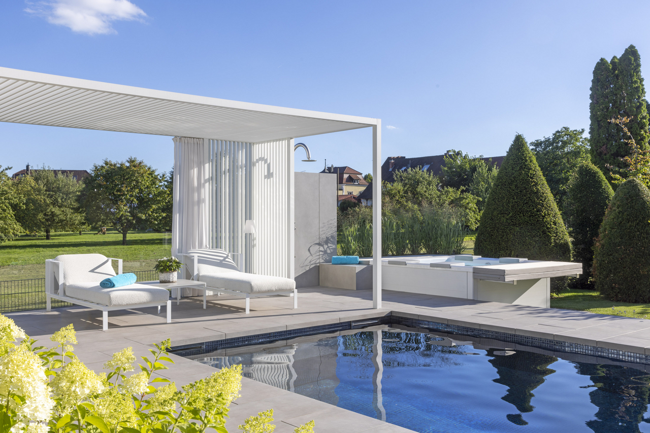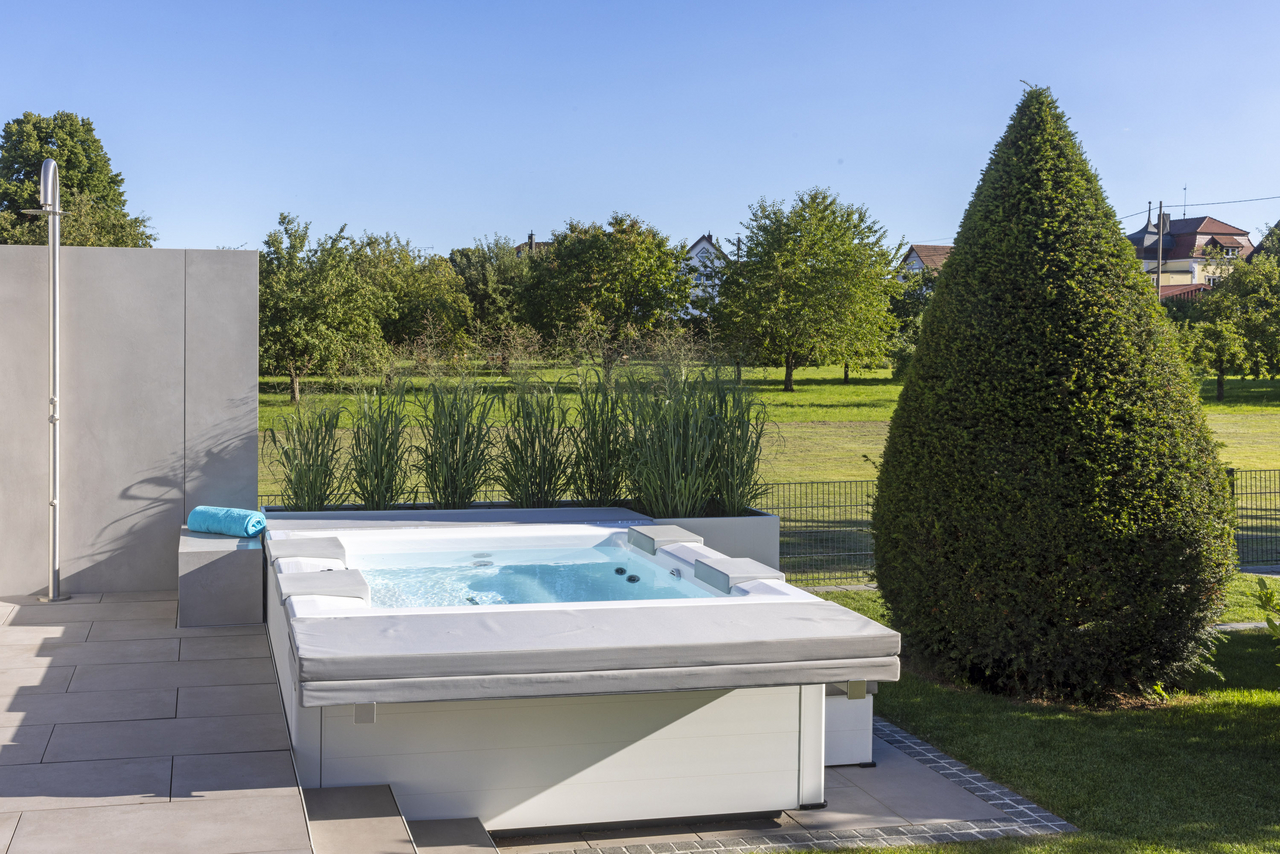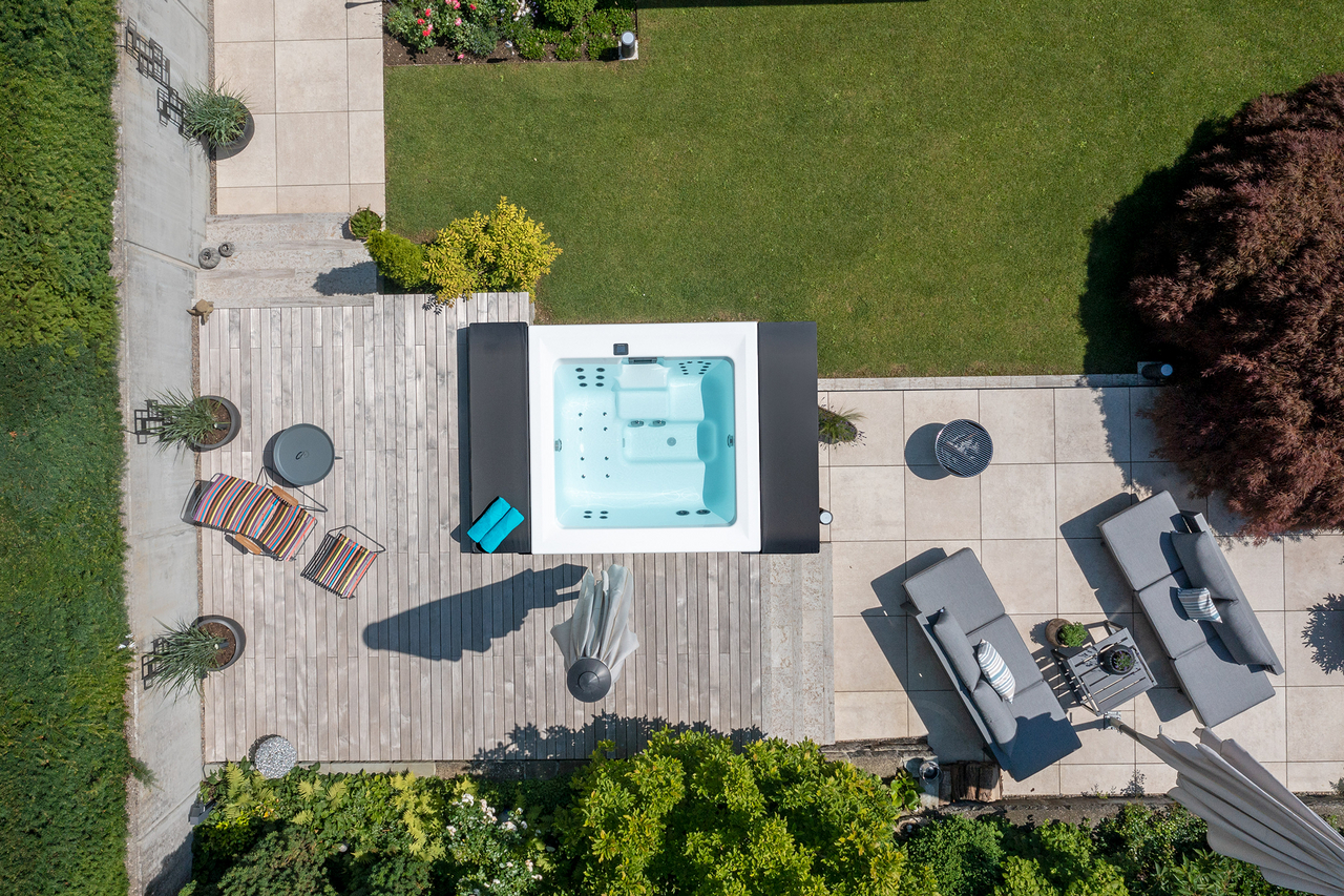 These pools are sensational wherever you place them, whether indoor or in the garden, as they use high-quality aluminium panels and have a patented hardtop cover. We use an extremely high-quality white sanitary acrylic so that the water appears fresh and blue. The pool cladding is available in three colours and two different options: from the highly elegant matt white to anthracite to warm beige. You choose between the sporty “Lite version” with white corner elements or you choose the “Elegance version” – for an elegant and chic design.