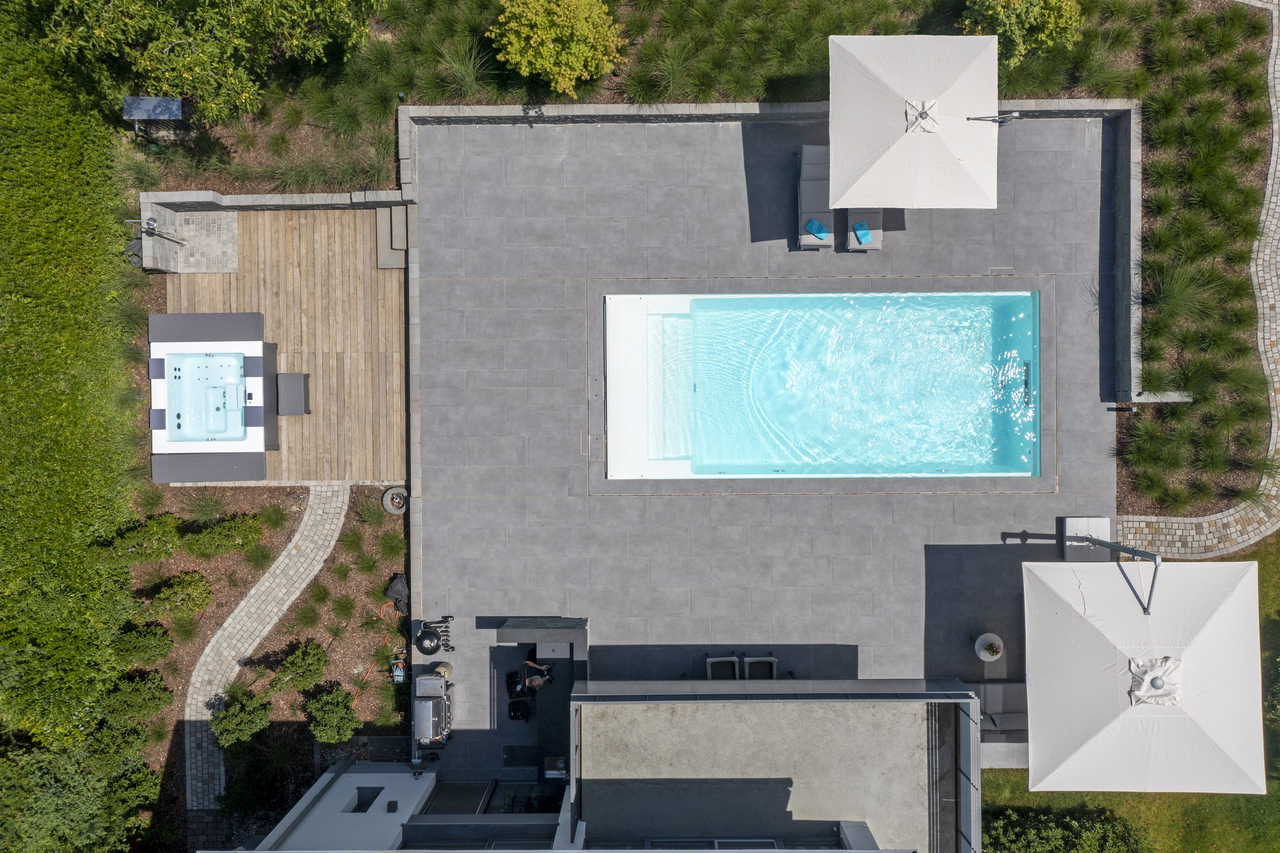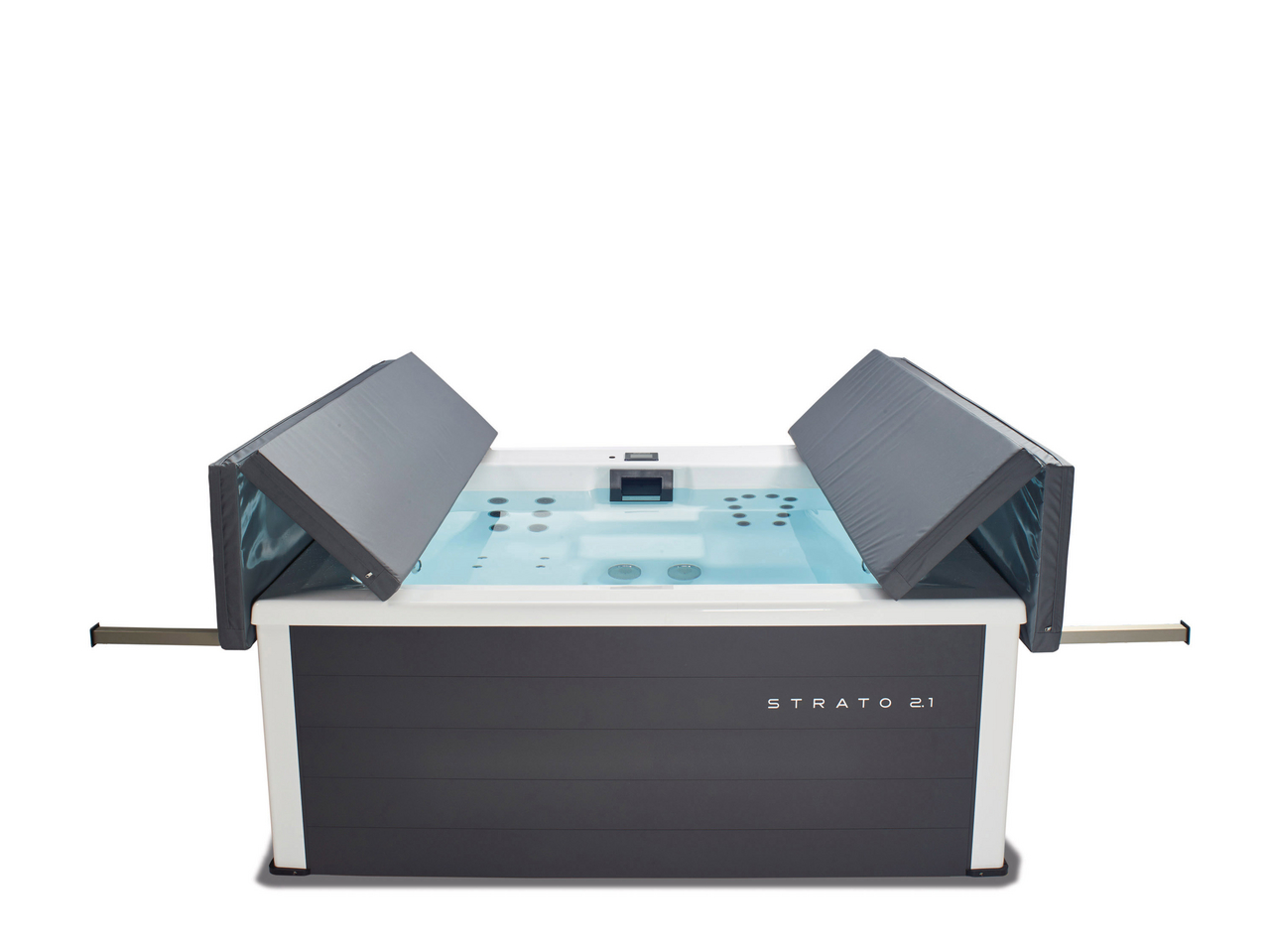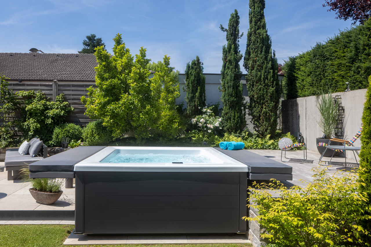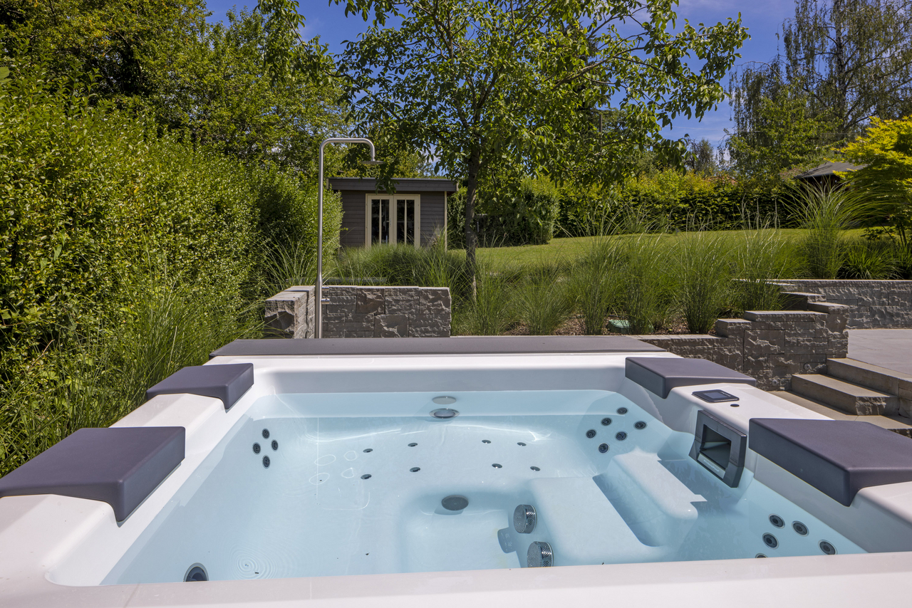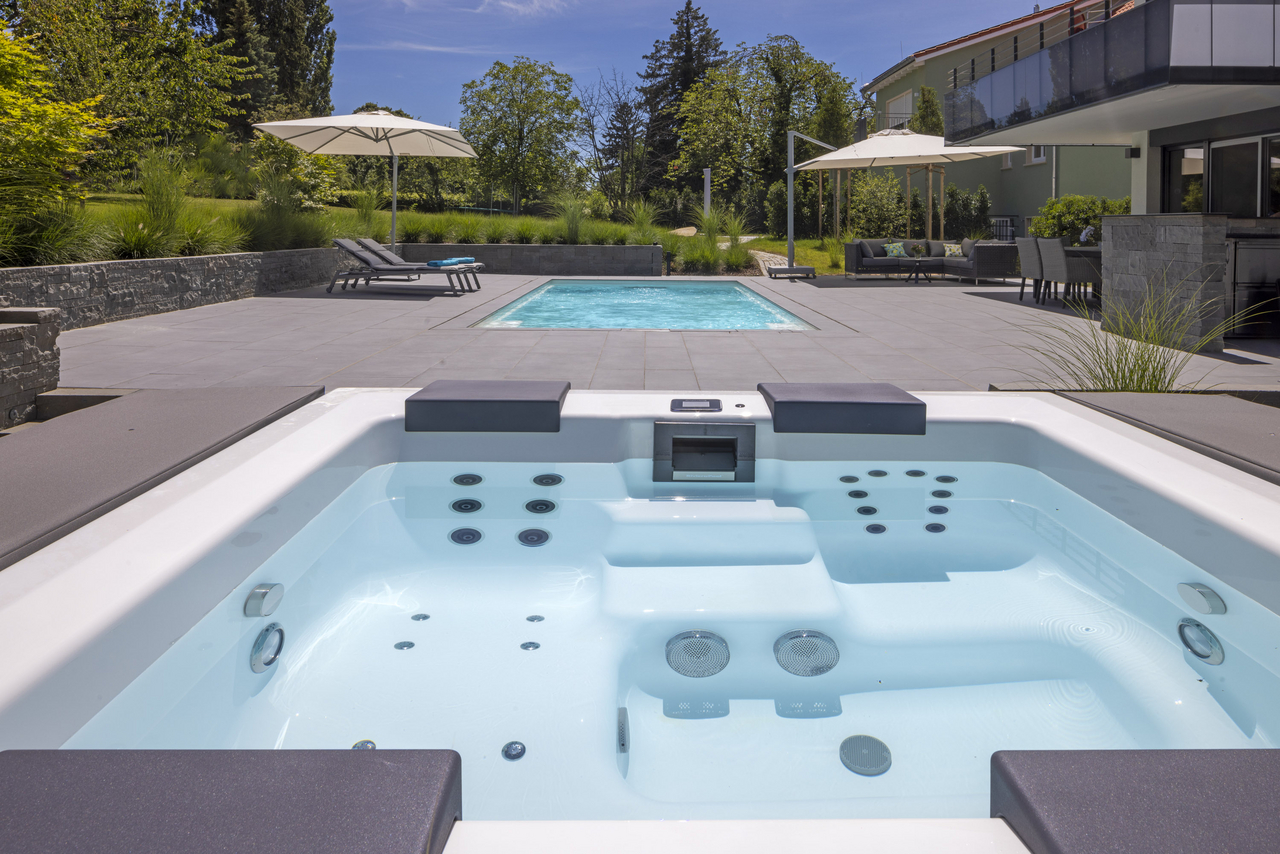 These pools are sensational wherever you place them, whether indoor or in the garden, as they use high-quality aluminium panels and have a patented hardtop cover. We use an extremely high-quality white sanitary acrylic so that the water appears fresh and blue. The pool cladding is available in three colours and two different options: from the highly elegant matt white to anthracite to warm beige. You choose between the sporty “Lite version” with white corner elements or you choose the “Elegance version” – for an elegant and chic design.